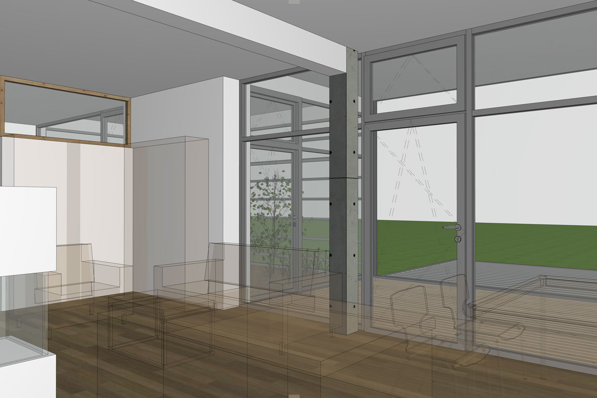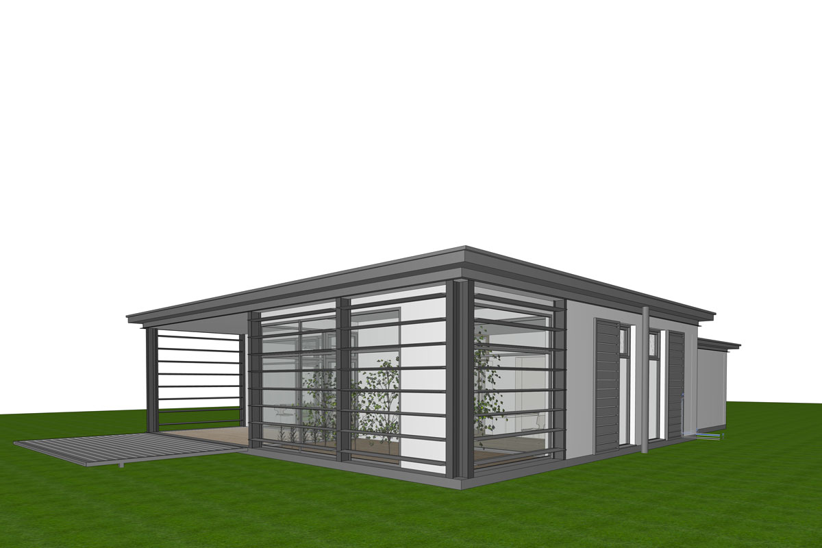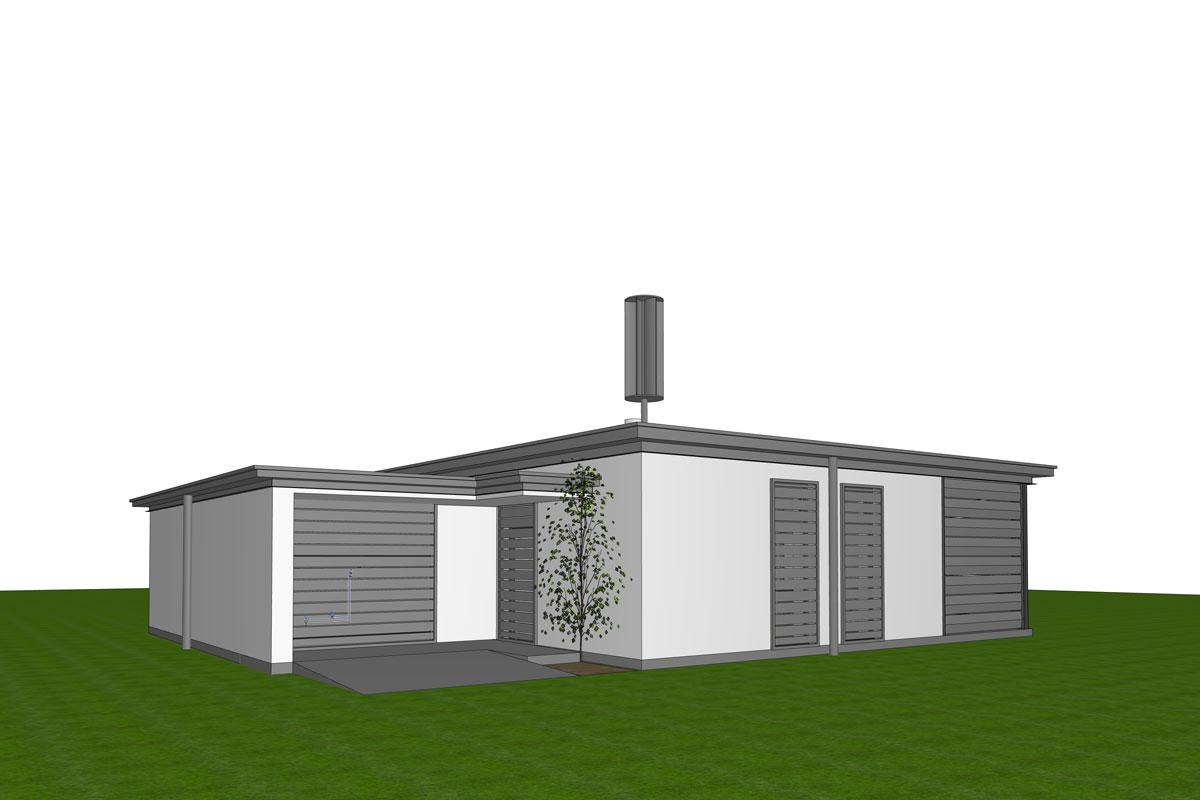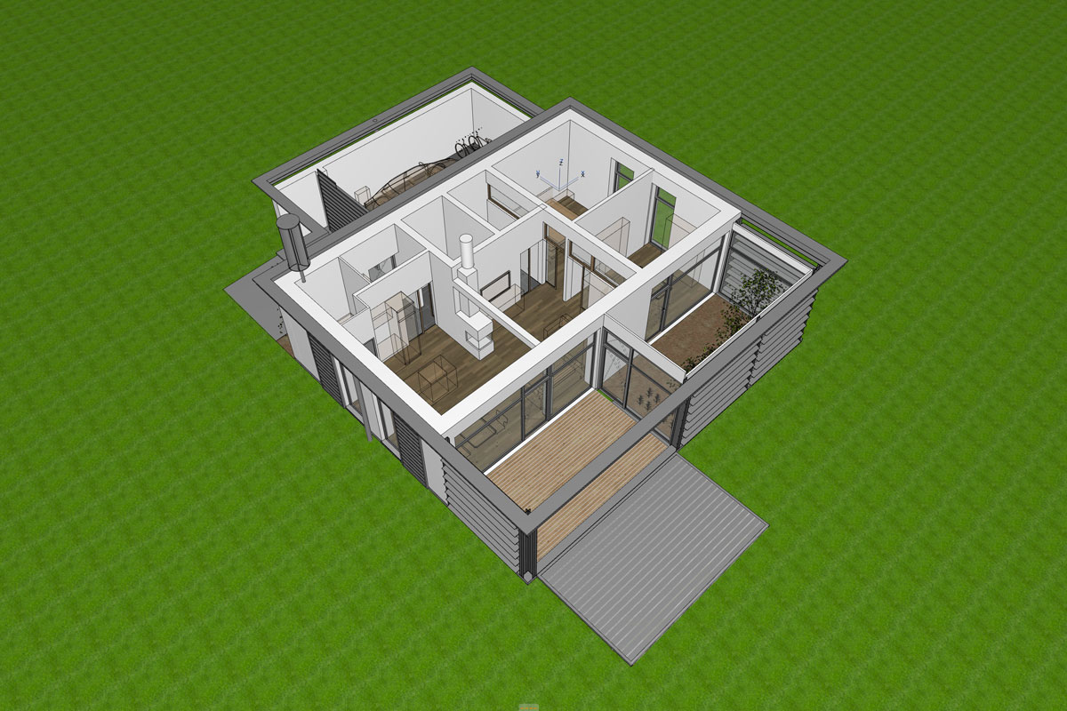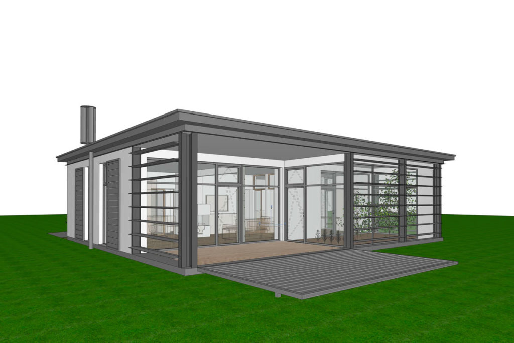 Mit überdachter Terrasse, ausklappbarer Terrasse und je nach Eingangssituation spiegelbarem Grundriss. 1 Schlafzimmer, Solarfassade. Das Modell 65 ist zudem stapelbar und kann ideal für Wohnhausprojekte eingesetzt werden.